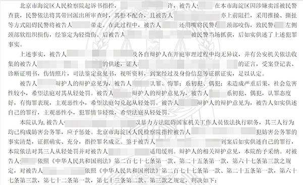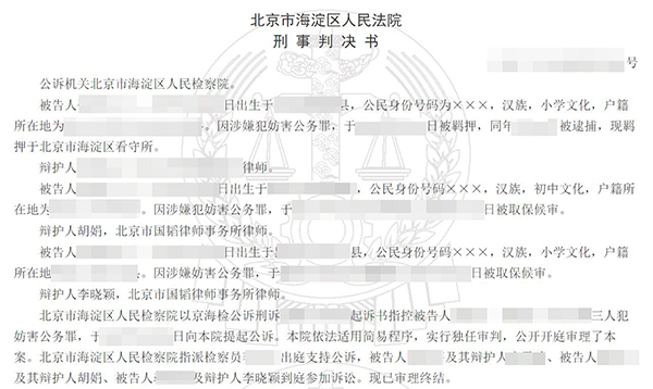 张某、李某、王某因为袭警涉嫌妨害公务罪被刑事拘留,羁押在北京市海淀区看守所。李某、王某委托了北京市国韬律师事务所律师胡娟、李晓颖作为辩护人,被取保并判处缓刑,同案张某被判处有期徒刑六个月。