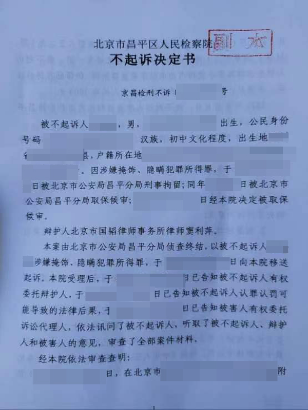 李某因配合转移盗窃的电动车,涉嫌掩饰隐瞒所得罪被北京市公安局昌平分局刑事拘留,经北京市国韬律师事务所李在珂律师团队窦利萍律师提供法律帮助,被取保候审,并且后续昌平检察院采纳了律师提交的不予起诉的法律意见,昌平区人民检察院决定不起诉处理。